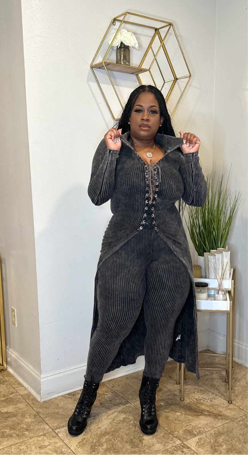 Mineral wash lace-up cardigan legging set/ black